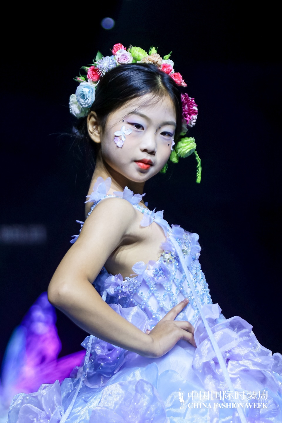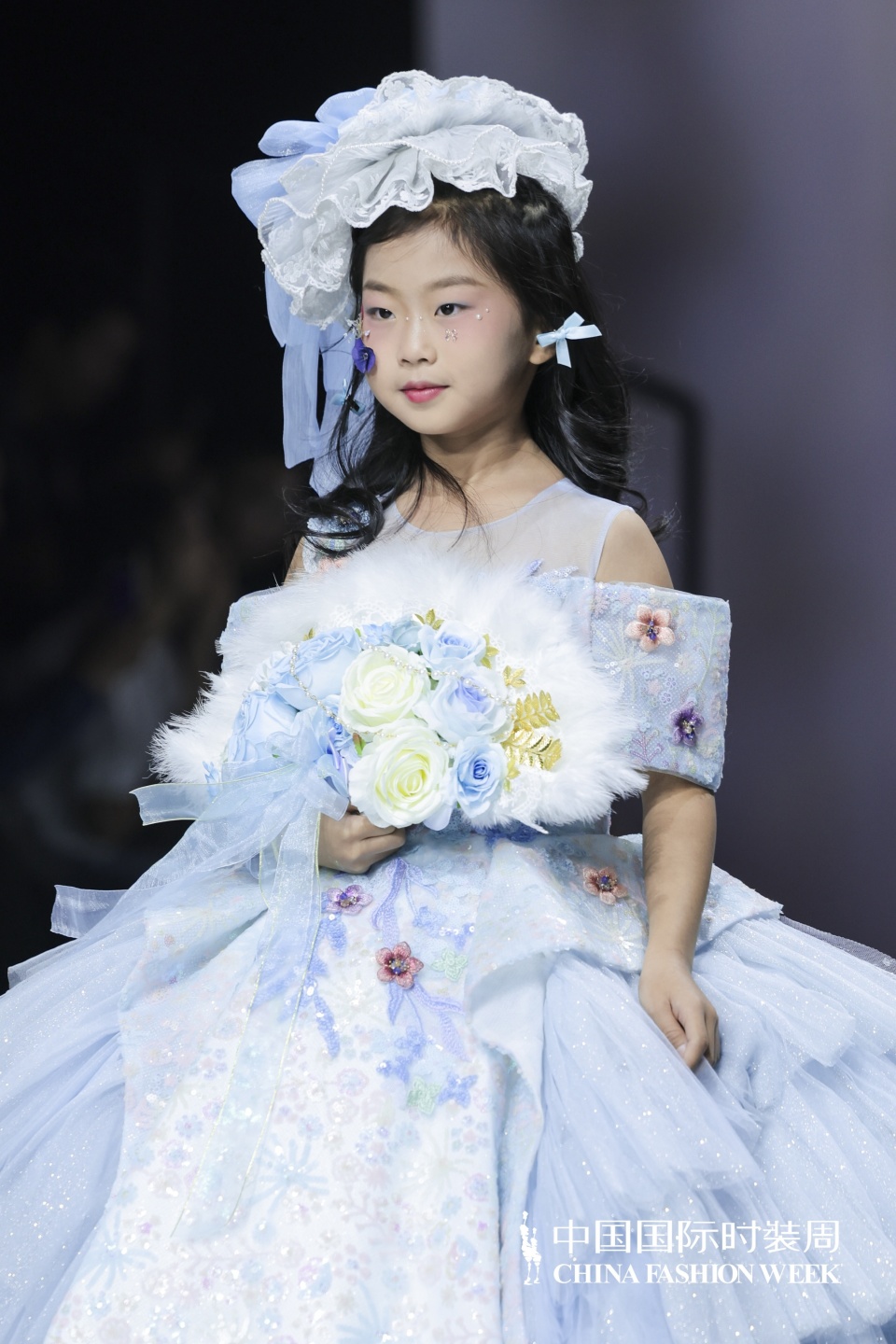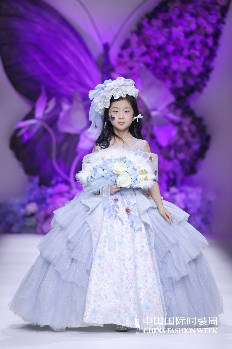 而在港岛七公主的秀场上,又是另一番如梦似幻的景象。港岛七公主 Lucky Seven 始终专注于为全球儿童编织华丽的童话梦境,此次秀场主题“爱丽丝梦游仙境”更是将经典童话元素与时尚设计进行了深度的交融与创新演绎。安梓萌身着少女感十足的天蓝色和粉紫色系礼服,宛如从童话绘本中走出的爱丽丝,优雅地漫步于 T 台之上。礼服上开满鲜花的温柔设计,甜美梦幻的气息扑面而来,让人仿佛置身于春日的繁花盛景之中;美丽绽放的蓬蓬大裙摆随着她的步伐轻轻摇曳,似在诉说着青春的明媚与张扬;层层叠加的轻盈渐变色,为她增添了几分俏皮可爱的灵动韵味。安梓萌在 T 台上的表现游刃有余,她的台步节奏把握精准,每一次转身、每一次停顿都恰到好处,如同在仙境中举行的一场盛大舞会中翩翩起舞的公主,她用自己的姿态与表情,生动地诠释着爱丽丝在梦游仙境中的奇妙经历与情感变化,将观众带入了一个充满奇妙幻想和无尽美好的童话世界。